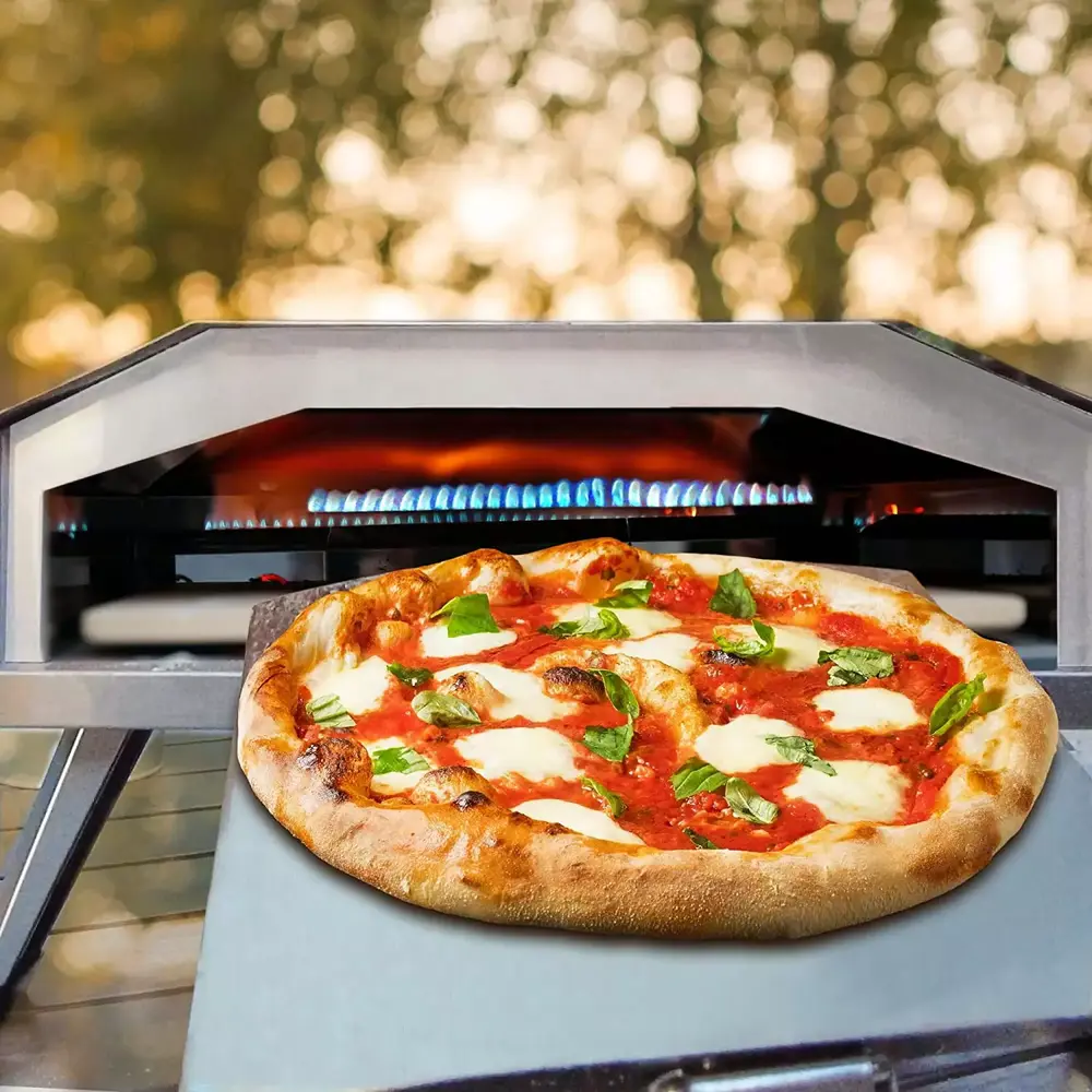 - ?? You don’t worry about the length of wire as same as oven. you could move the pizza oven to anywhere you wanna go. Outdoor Pizza Oven configures 13 pizza stone. larger cooking area can cook direct heating from the inside. shorten the baking time. the pizza stone is better insulation. and pizza dough contact is not easy to cool down