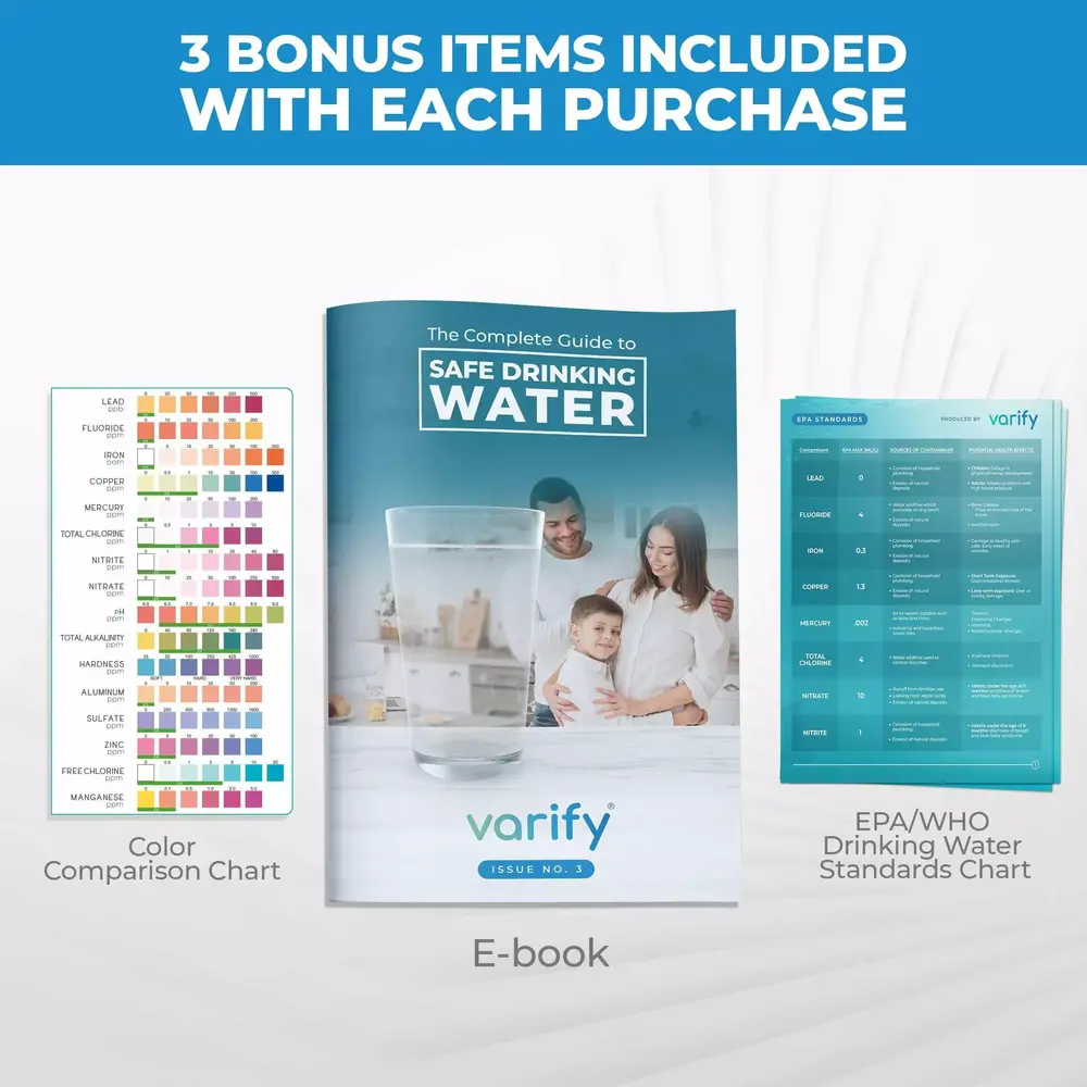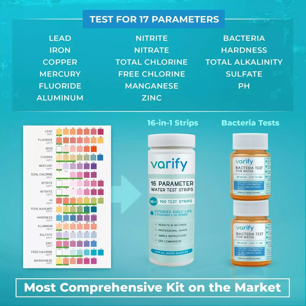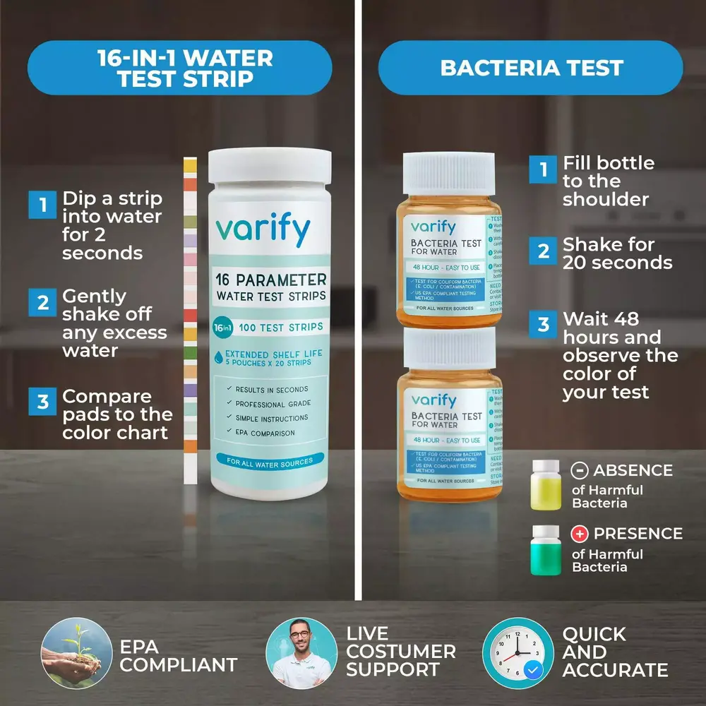 Easy and quick to use. This water test kit is very easy to use. and provides results within two minutes! (Except for the Bacteria Tests). No need to be an expert. just follow the step-by-step instructions. Our all-in-one test kit ensures that whichever water source you’re testing is safe to drink. For every contaminant. you need varify’s complete drinking water test kit includes 17 different parameters for one affordable price. Test contaminants. which can cause serious health problems; lead. which causes kidney damage; and fluoride. which can cause?? irreversible damage to your bones. Our kit currently tests for the widest array of harmful contaminants. Made to EPA Standards. The majority of water quality tests are designed to test low-quality water. and will not give you accurate results for drinking water. Varify takes pride in the quality of our products and assures reliable results for drinking water. All tests are made to EPA Standards. Guaranteed Customer Satisfaction. What is in the Kit 100 premium strips – 16 parameters. 2 complete bacteria tests. 1 sample test Tube. 1 full instruction booklet 3 bonus items in every package. Guide to safe drinking water – Ebook extra color comparison chart EPA standards comparison chart varify’s vision – Clean water worldwide our goal is to create accurate and affordable testing devices. all while supporting a charitable cause. 5% of each sale is donated to Water for Good – a nonprofit charity tackling water poverty in Central Africa.