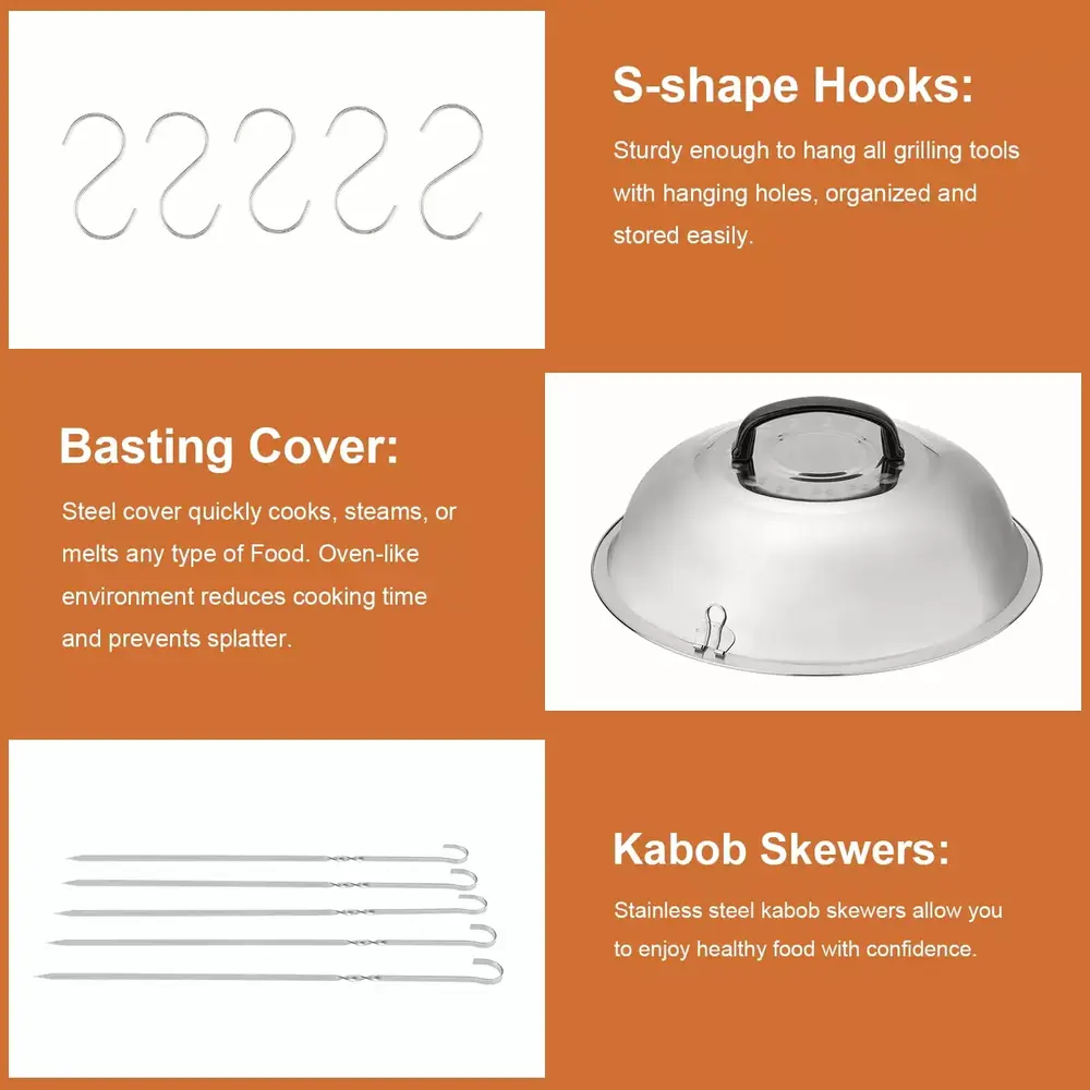 [Easy to Storage & Carry]All of the grill gadgets are packed in a compact storage bag. Each tool can be placed in an orderly manner and better protected in the compact storage bag. Easy to store and can take it anywhere anytime to comping or picnic. Convenient hangers are provided for easy storage and food grade grill tools are easily cleaned with warm. soapy water. Now anyone.newbie or master griller can enjoy grilling much faster.easier.cleaner.