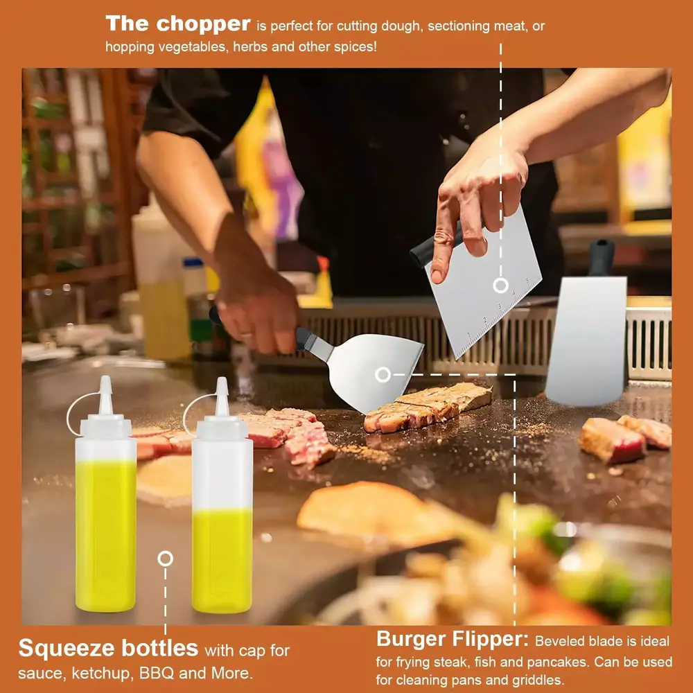 [Must have griddle accessories kit] Our grill tools set with Scraper.spatulas and oil bottles are necessary griddle tools for griddle chef. These griddle utensils set will allow you complete all the griddle applications. Great for flipping burgers. pancakes. veggies. cutting bread.meat and sausage. perfect to scraper griddle clean. Egg rings and pepper shakers to enhance your griddle cooking experience.Everything make your kitchen work becomes more simple.