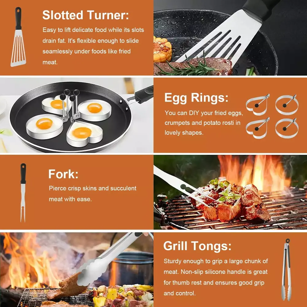 [COMPLETE 32pcs BBQ ACCESSORIES]Our grilling accessories are the best bbq utensils set. they have everything you need. It includes 4 Egg Ring. 1 Grill Tongs. 1 Griddle Chopper. 1 Cleaning Brush. 2 Squeeze Bottle. 1 Blade Scraper.1 Spatula. 1 Slotted Spatula. 1 Fish Turner. 2 Spice Shaker. 1 Grill Brush. 1 Gril Fork. 1 Basting Cover. 1 Gloves. 5 Kabob Skewers. 5 Hanging Hooks and 1 Carry Bag.