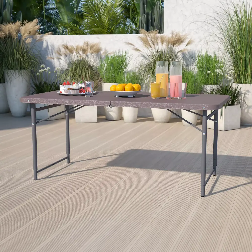 BizChair 4-Foot Height Adjustable Bi-Fold Brown Wood Grain Plastic Folding Table