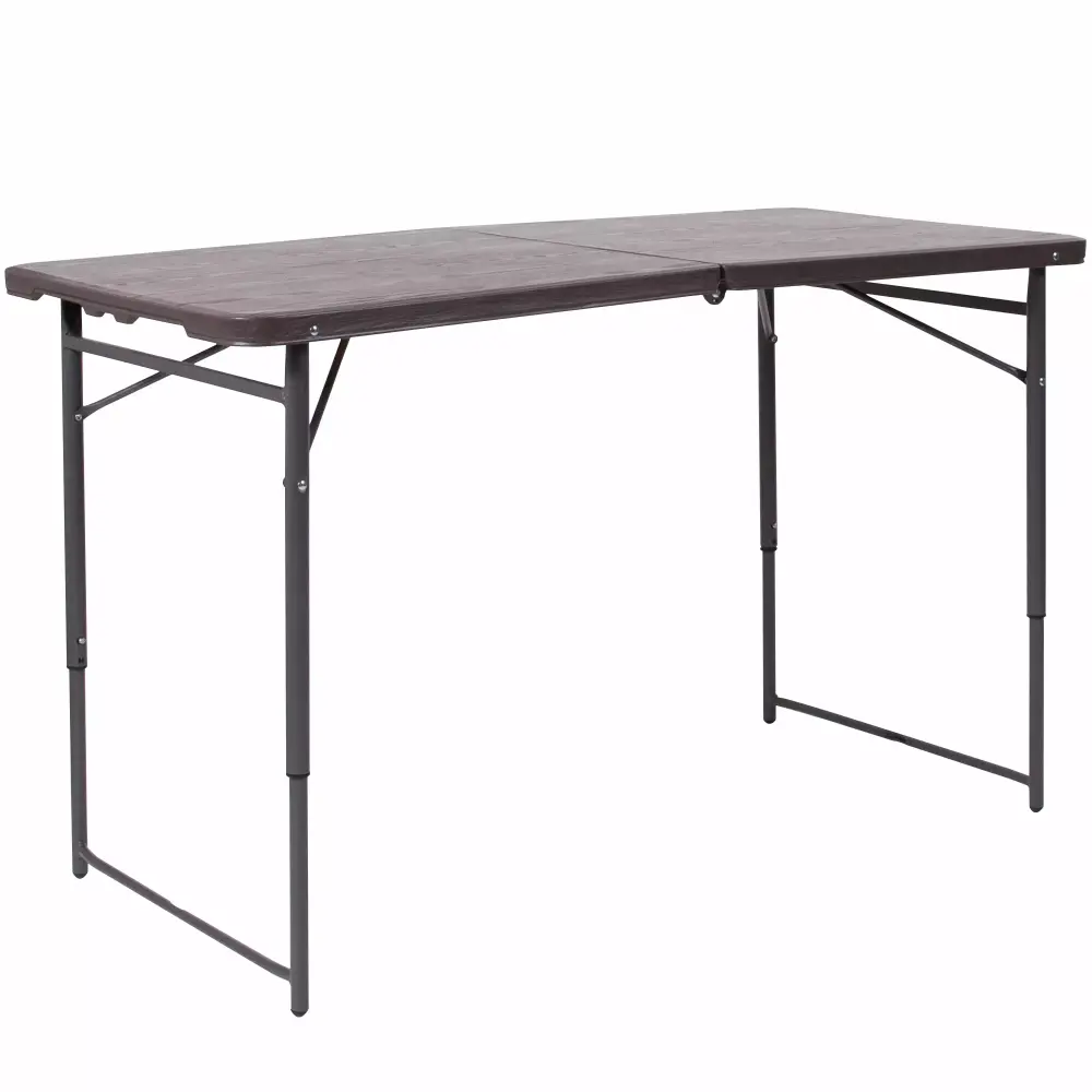 • BizChair 4-Foot Height Adjustable Bi-Fold Brown Wood Grain Plastic Folding Table with Carrying Handle