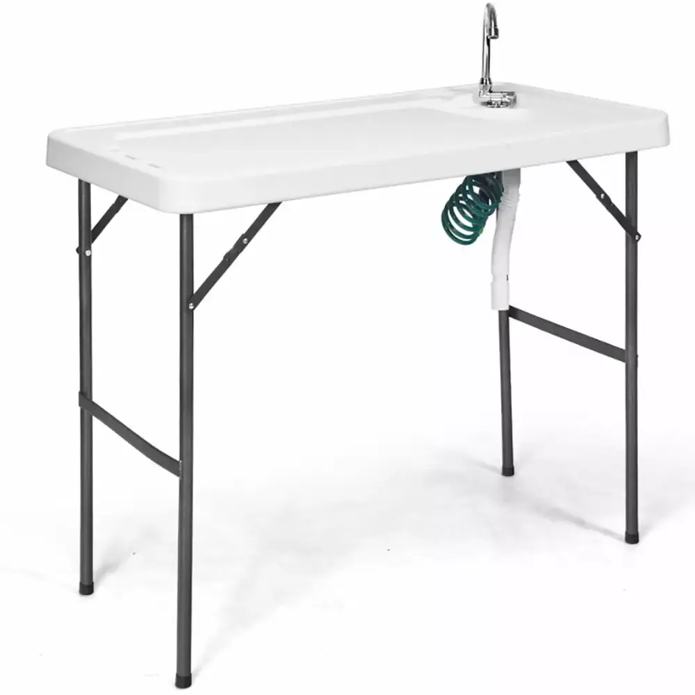 This deluxe cleaning table provides a portable sturdy and efficient work area for all your outdoor needs from cleaning fish and small game to potting plants. The quick-connect faucet is simple to set up and attach to a garden hose & the extending sprayer gives you water pressure where you need it. With a durable sloped surface and integrated sink with drain this table gives you the convenience of your kitchen in the great outdoors. The folding legs allow you to take this table anywhere. It is east to store it when your work is done. Don’t hesitate to buy it! Quick-connect faucet and extending sprayer are perfect for cleaning fish and game Easily connects to garden hose and has integrated sink with drain for added convenience Sloped surface and raised edges help maintain a clean working area Table top is made of extremely safe sturdy plastic Leg is Powder coated finished Folding legs allow for easy storage and portability