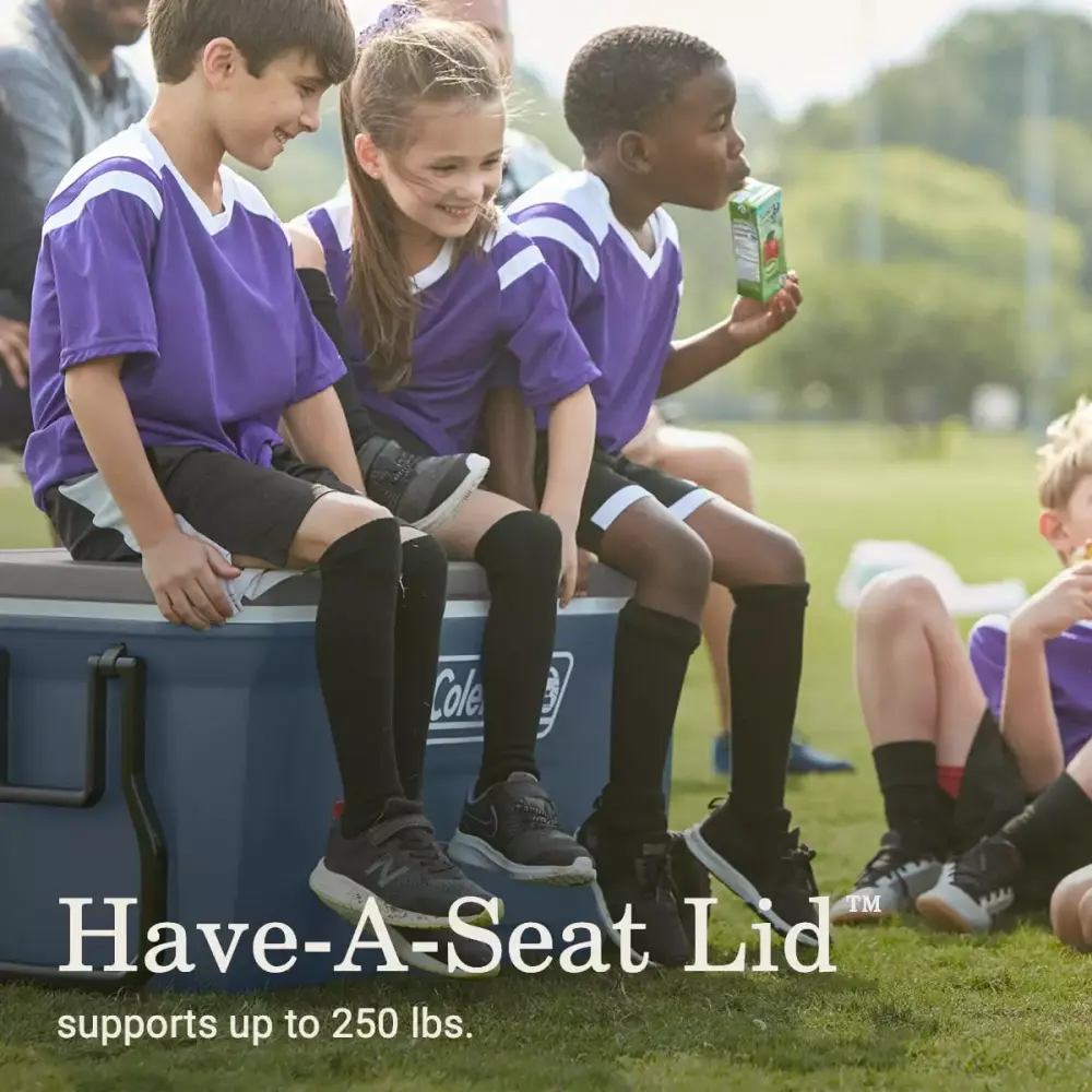 Inspired by our Wichita roots and the people who work there. the Coleman® 316 Series of hard coolers brings uncompromising quality and a legacy of craftsmanship and adventure wherever you take them. The Coleman 316 Series 100 QT Wheeled Cooler Lakeside Blue. has all the features you’ll need for the outdoors from tailgating with friends to annual camping trips. The fully insulated lid and body Keeps the Ice for up to 5 days in temperatures as high as 90°F so you can enjoy cold drinks at the campsite after hiking the trails or cooking hearty meals. Going to the beach The heavy-duty 6-inch wheels and durable tow & swing-up handles help you haul a full load while staking out the perfect spot. Drinks are always within reach and don’t spill because of the cup holders molded to the lid. If more guests swing by the tailgate or picnic. you’ve got an extra seat with the Have-A-Seat lid that supports up to 250 lbs. The large capacity holds up to 80 cans with 50 lbs. of ice so you’ll have plenty of drinks for you. your crew. and anyone else who wants to join in on the fun.