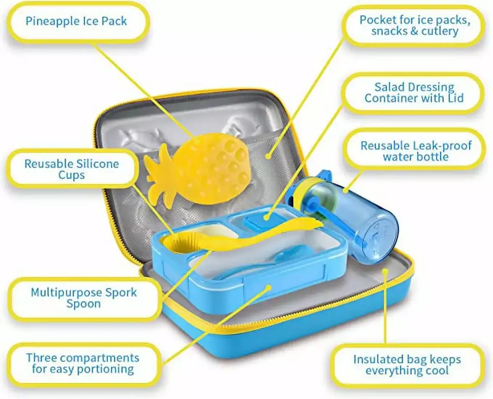 A beautiful Shark lunch bag. Thermal insulation. and Easy to clean. a Reusable Leak-proof water bottle. and a Three compartment lunch box with Multipurpose Spork Spoon. Reusable Silicone Cups. Salad Dressing Container with Lid. Pineapple Ice pack.Ideal for daycare. school. picnics. or the beach. Keep your child nourished and hydrated on the go.