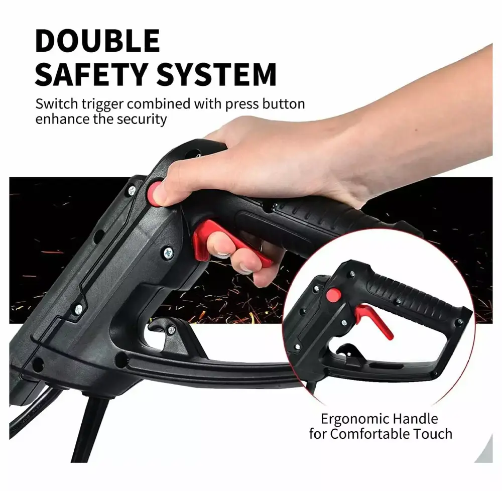 - Double Safety System: In order to ensure safety during use. our electric garden tiller is equipped with an on/off trigger and push-type safety button. The double safety system is more secure. In addition. the sturdy and wide protective shield can prevents sand and stone splashes from hurting people and play a very good protective role.