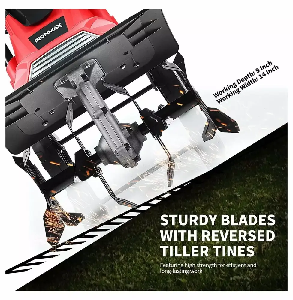 - Ideal Working Width and Depth: This tiller cultivator has 4 high-hardness blades. and the sharp teeth ensure easy and long-lasting work. The planting width of our cultivator can reach 14 inches. and the depth can reach 9 inches. A reasonable working width and depth can efficiently complete a large area of work.