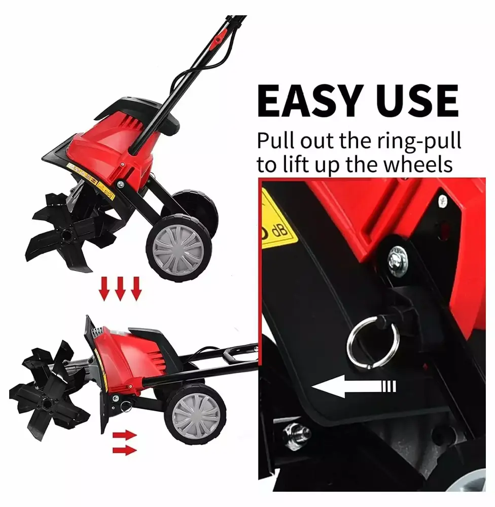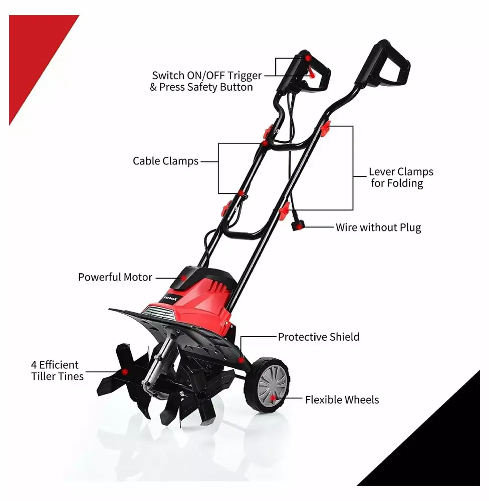 Description: Are you still struggling with your garden work? Our tiller cultivator comes with a powerful motor that can provide you with great power to handle your garden work. In addition. this tiller comes with 4 highly rigid blades that can serve you for a long time. Noteworthy is the ideal working width and depth to efficiently tackle large areas and work with depth requirements for you. Of course. the most important thing is safety. our cultivator comes with a double safety system. equipped with an onoff trigger and a push safety button. In addition. the sturdy and wide protective shield can prevents sand and stone splashes from hurting people. The important thing is that this tiller comes with a folding and lightweight design for easy movement and storage. Let it go and help you with your garden work! Features: Double safety system ensures safety when using Sturdy and wide shield can prevent sand and stone splashes from hurting people Lightweight and folding design is easy to move and store Ergonomic handle makes garden work easy Hardness of the blade can be used for a long time Ideal working depth and width for efficient work Powerful motor provides continuous power Suitable for small and medium-sized vegetable gardens. orchards. greenhouses. etc. Easy to operate and maintain Specifications: Color: Black ?? Red Overall Dimension: 41 x 40 x 14.5 (L x W x H) Blades: 4 Voltage: 120V60Hz Power: 10 Amp Working Width: 14 Working Depth: 9 Speed: 365 RPM Net Weight: 18 lbs Package includes?? 1 x Electric Tiller and Cultivator 1 X User