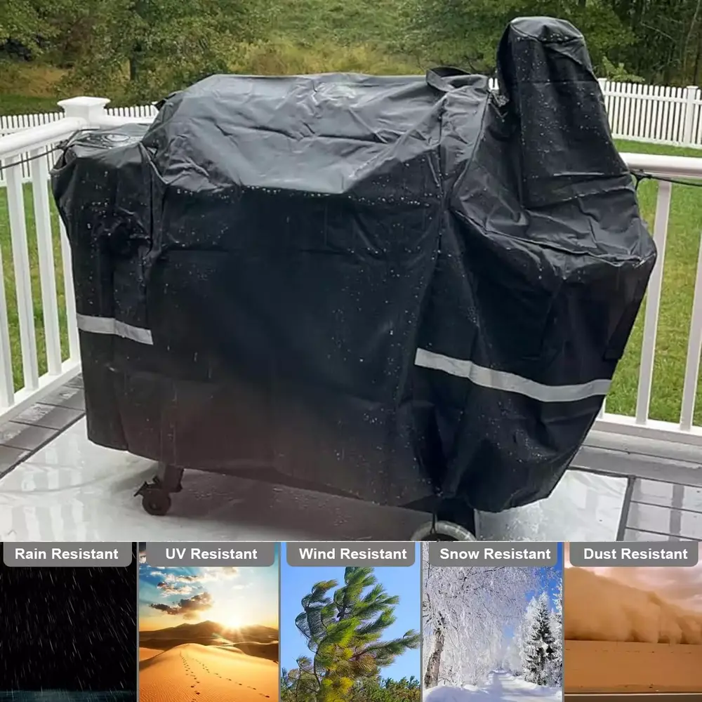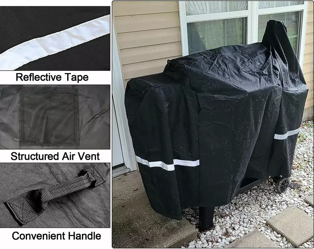 [COMPATIBILITY WITH]Grill Cover Pit Boss 820 deluxe. pro 850 Series. 820D. 820FB 820D3 820SC 820XL 820PS1. Pit Boss 820CS1 Competition. Sportsman 820 Series Wood Pellet Grills. Designs for Pit Boss PB820PS1. PB850PS2. PB820D. PB820D3. PB820XL. PB820ME. PB820FB. PB820. PB0820D3. PB0500SP. PB550G with no side tray. Also Fits for Z grill 700 series. z grills 700d4e. ZPG-7002BPro. ZPG-7002C ZPG-7002C2E models. Does not fits austin XL/1000S/1100 pro series. Dimension: 56" L x 27" W x 50" H. [WATERPROOF & DURABLE]The pit boss 850 pro series cover is made of heavy duty special 600 denier polyester oxford fabric with waterproof PVC coating that won’t tear easily and the double seam line seam is treated with a special sealing tape. so you don’t have to worry about water leaking through the seam. It can with stand strong winds. rain. storms. sunlight. dust. grime. snow. The grill cover effectively covers your grill and protects it against Mother Nature’s harsh stressors. [PRODUCT ADVANTAGES]?Reflective Tape: With the reflective tape. you can quickly see your grill in the dark (within 300 meters). ?Convenient Handles: Durable fabric handles at two sides for easily fitting and moving. It can also be used for hanging and storage. ?Breathability: Structured air vents stay open to ventilate. There are lined with mesh barriers. which can speed up the heat dissipation and let the grill to cool down faster. [WINDPROOF DESIGN]The adjustable drawstring straps at the bottom are designed to tighten the excess and prevent excess water vapor from entering for a perfect fit. Fastening straps prevent your heavy duty grill cover from blowing away on windy days. [EASY CLEANING]Simply rinse with water. the dirt will soon disappear and leave the grill cover to air dry in the sun. The outdoor grill cover protects your grill all year round. keeping it clean and dry so you can enjoy your barbecue party whenever you want. Note: Please allow the grill to cool completely before putting the cover on. If you have any questions about the product. please contact us.Grill Cover for Pit Boss Pro Series 850. 820 Wood Pellet Grill. 600D Heavy Duty Smoker Cover for 820D/ 820FB/ 820D3/ 820SC/ 820XL/ Z Grill 700 Series. All Weather Protection Waterproof BBQ Grill Cover