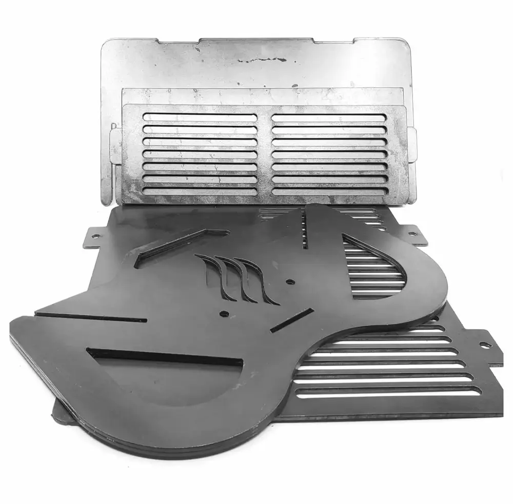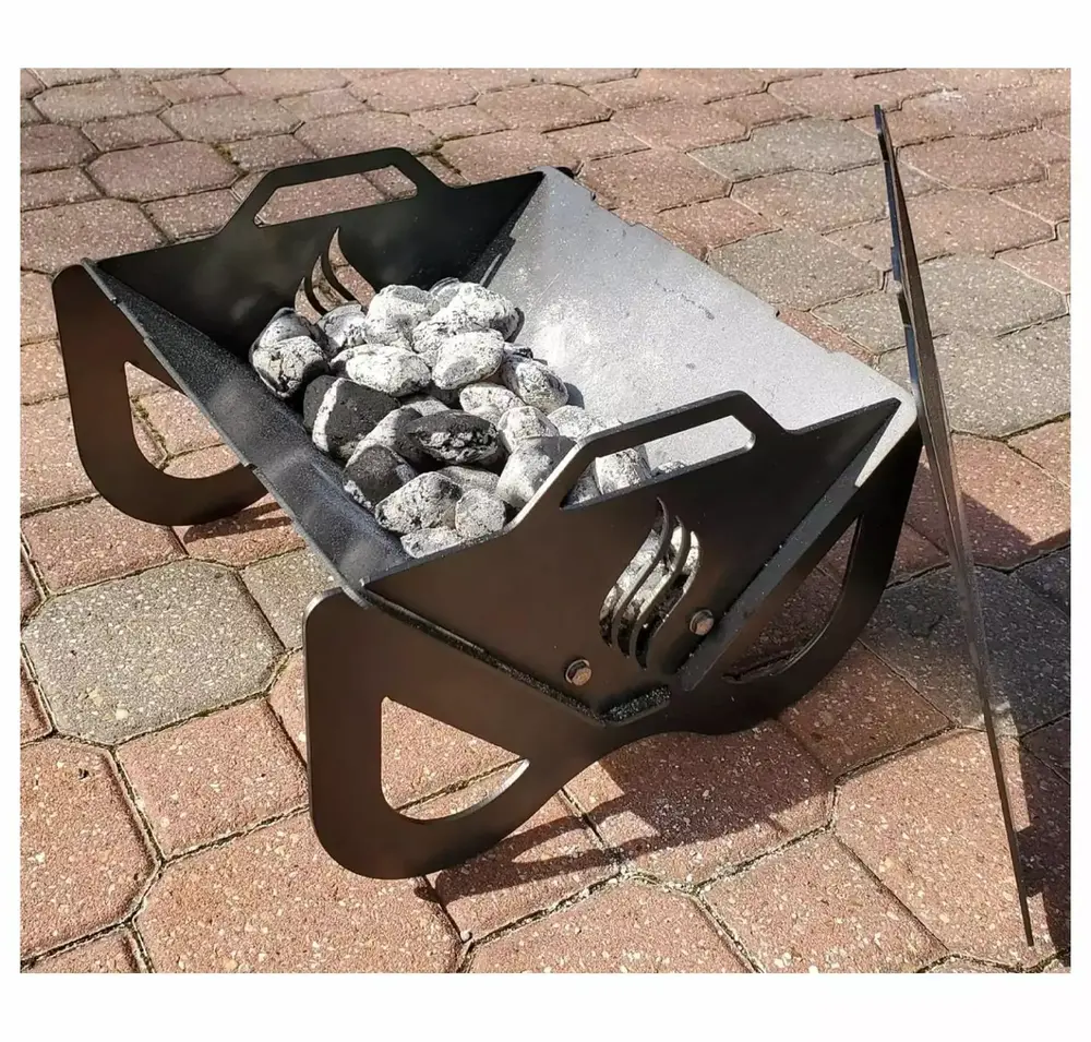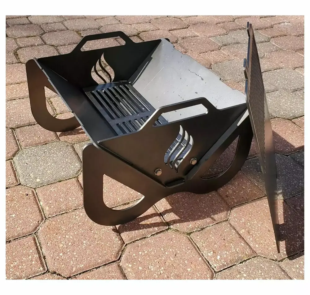 The Hunsaker Portable Camping Grill is the perfect grill for your next camping trip. It is collapsible. so it is easy to transport and set up. It is also made of durable materials that will withstand the . The grill has a grill grate on one side and a griddle on the other. so you can cook a variety of foods. It also has an elevated charcoal grate that keeps air moving underneath the charcoal or wood for proper airflow. The grill heats quickly and evenly. and it has side air intakes that allow you to control the temperature. Weighs 21 lbs Made in USA (. MO) Grill grate surface measures 12.75" X 12.375" (157.78 square inches). 11 gauge steel for entire unit. Ships unpainted. Paint with high temperature or keep seasoned with cooking oil to keep rust . Assembled unit measures 13.25" L X 14.125" W X 9.375" tall