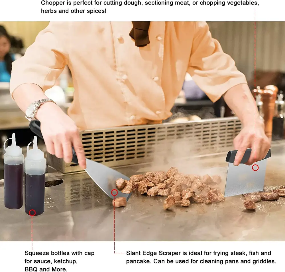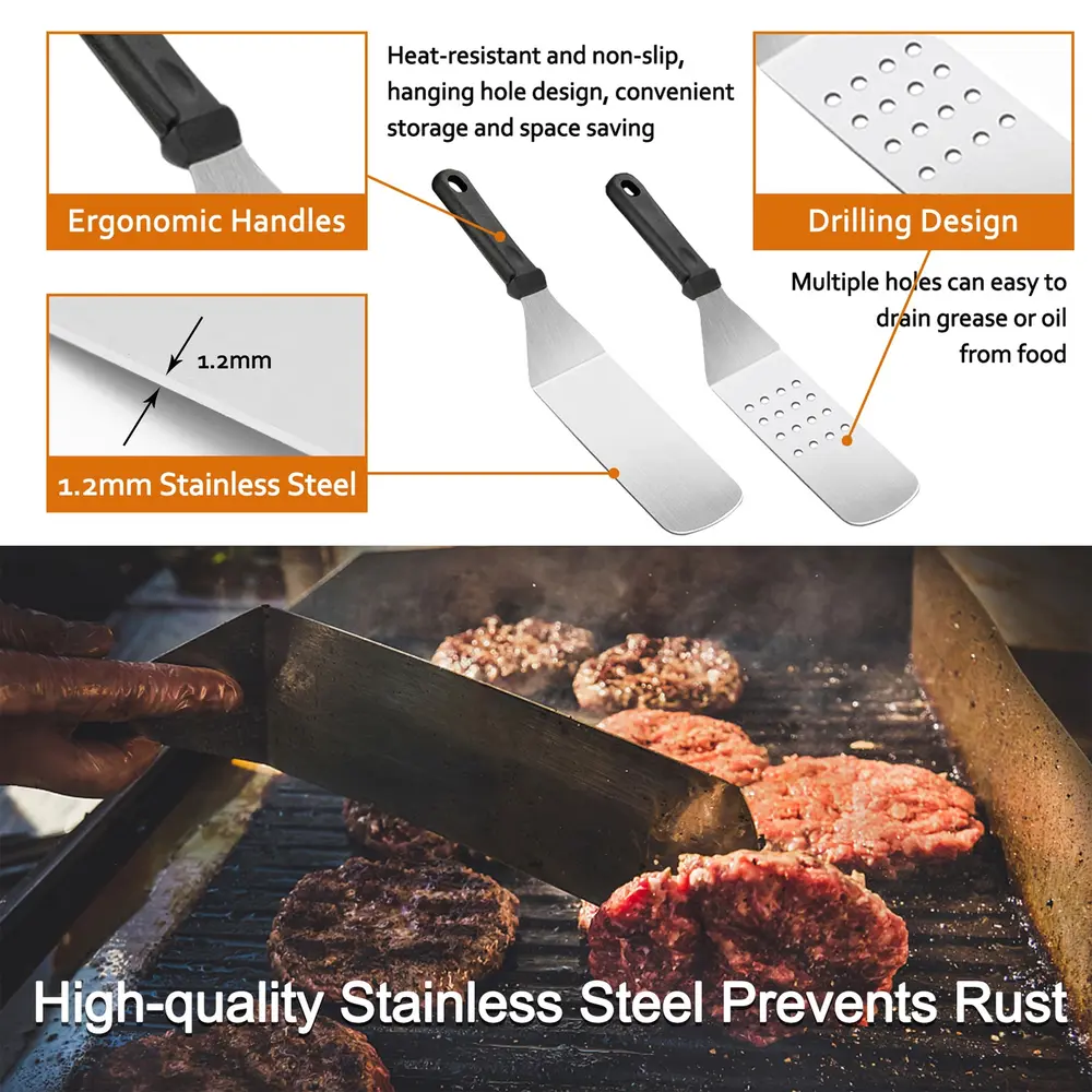 - ??[HIGH QUALITY STAINLESS STEEL MATERIAL] The griddle tools are made of high-quality stainless steel. which is rust-proof and heat-resistant. Spatula. slotted spatula. hamburger turner and scraper are equipped with an ergonomic handle for heat and slip resistance. so you can use it comfortably. The end has a hanging hole design. which is convenient for storage and saving kitchen space.