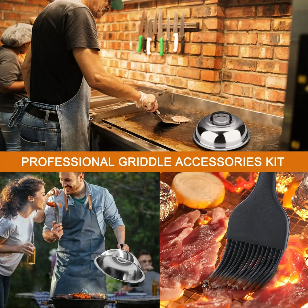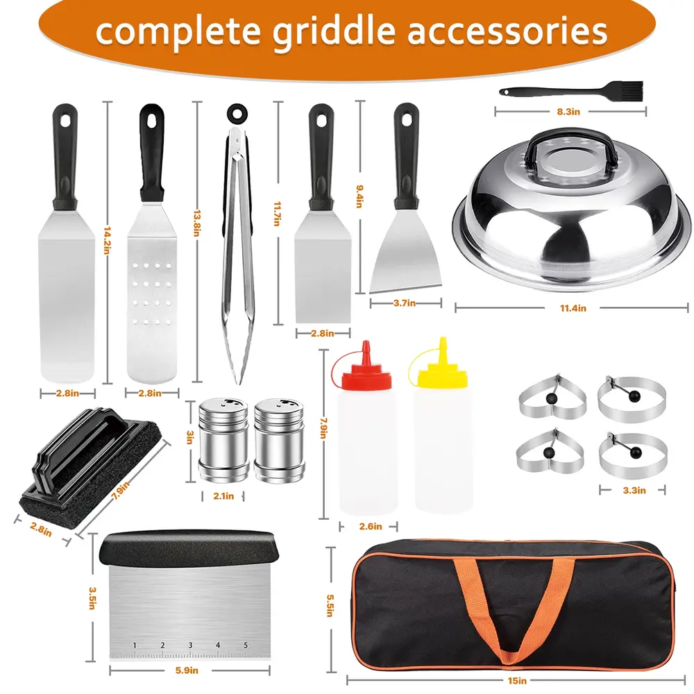 - ??[VALUE GRIDDLE ACCESSORIES SET] Our griddle accessories set has complete barbecue tools including 1 x spatula.1x slotted spatula.1x hamburger turner.1x scraper.1x chopper.1x grill tongs.1x basting cover.2x squeeze bottles.4x egg rings.1x cleaning brush.2x spice shakers.1x storage bag. All-in-one shopping can meet all your barbecue needs.