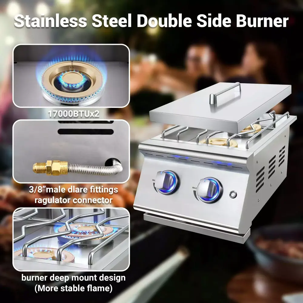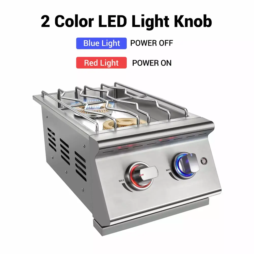 Experience rapid heat-up with robust flames from 2×17.000 BTU burners. perfect for quick boiling. Convertible between liquid propane and natural gas. this premium stainless steel double side burner ensures durability and skilled craftsmanship. Backed by a 2-year warranty and 24/7 customer support. it’s easy to install and use. with LED control knob lighting for nighttime cooking and entertaining.