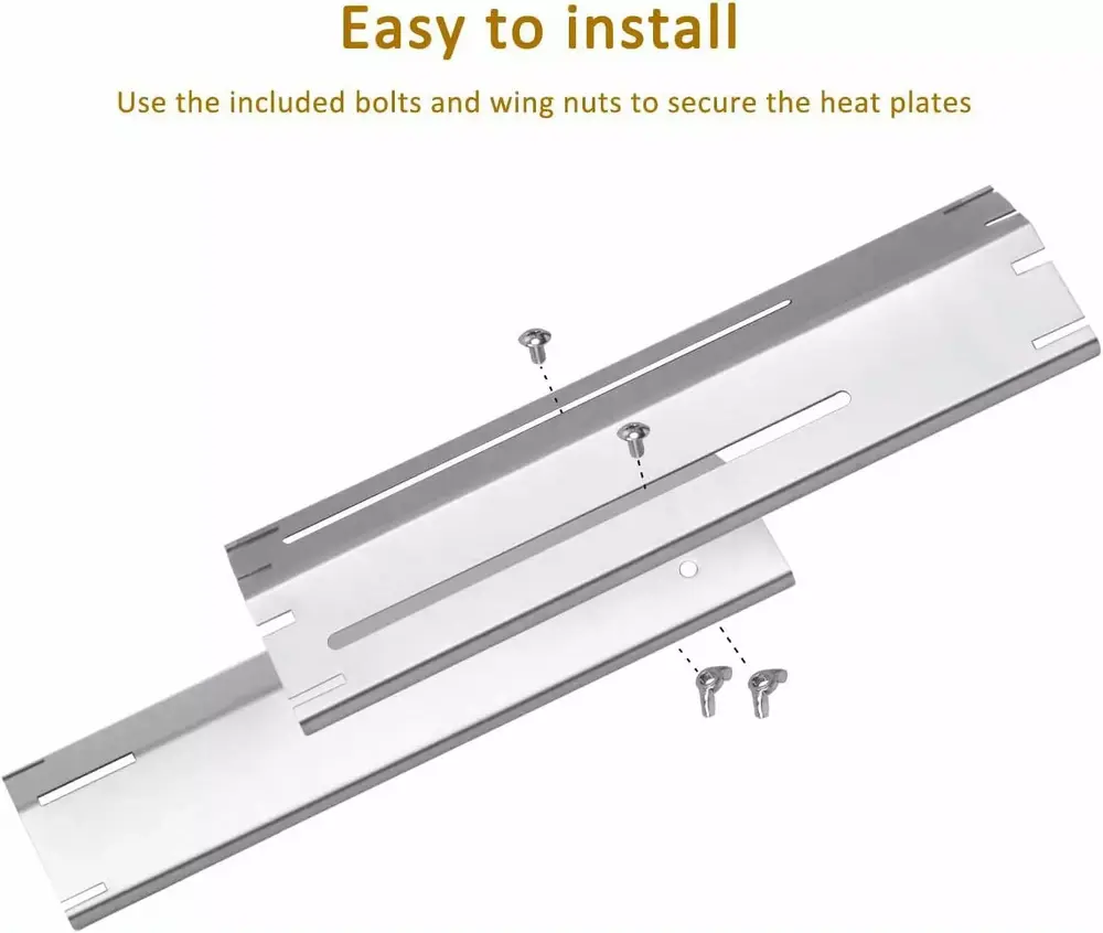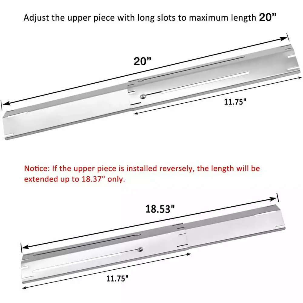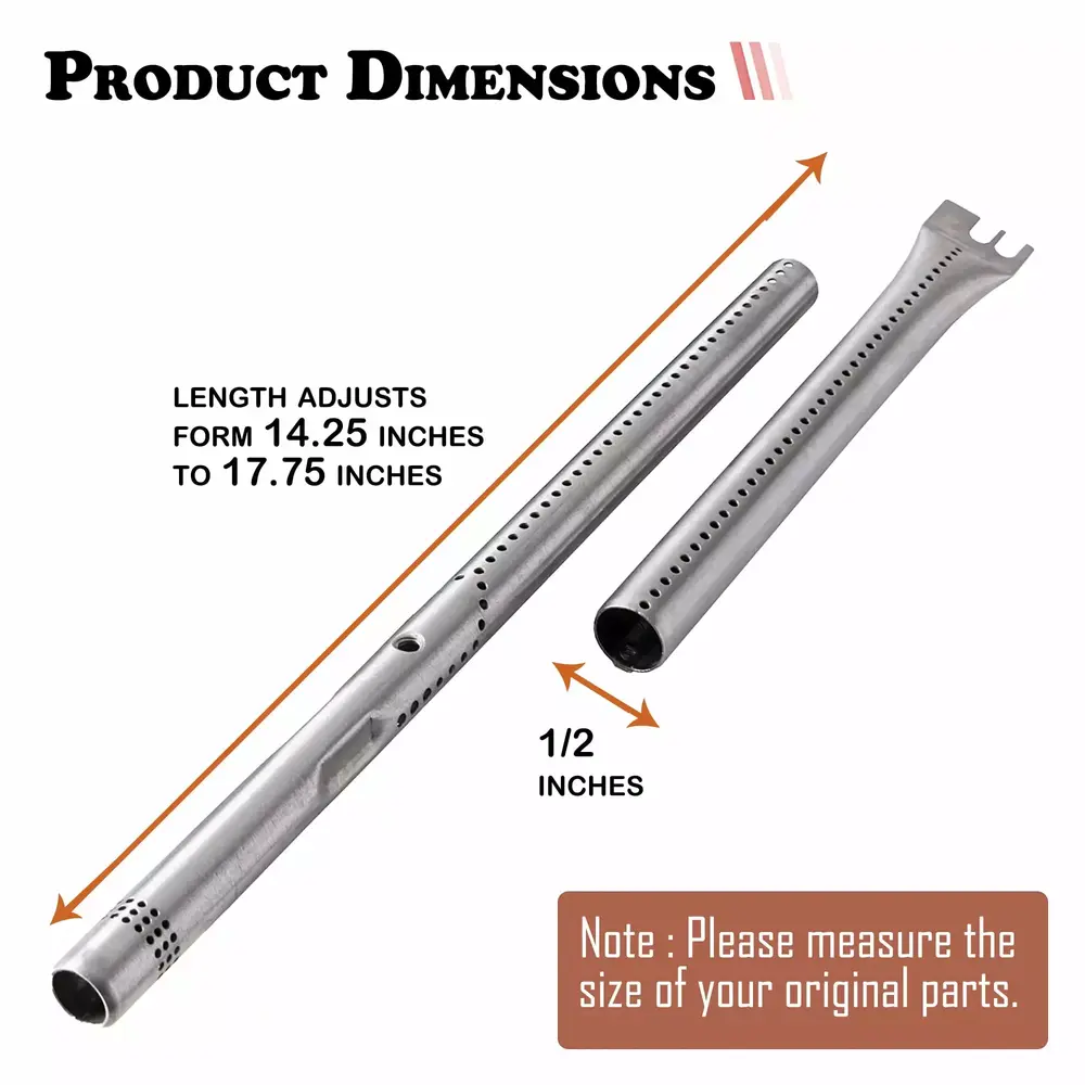Set of Four Universal Burners and Four Heat Plates for Gas Grill Models from Brinkmann. Charmglow. Master Forge and other Manufacturers. Universal parts work on a large range of gas grill models from several brands like Brinkmann. Charbroil. Kenmore. Nexgrill. Master Forge etc Burners are adjustable in length from 12 inches to 17.5 inches. Burner diameter is around 1 inch. Porcelain Heat Plate adjusts in length from 12 inches to 20 inches. Burners and Heat Plates are easy to adjust to your required size and easy to assemble.